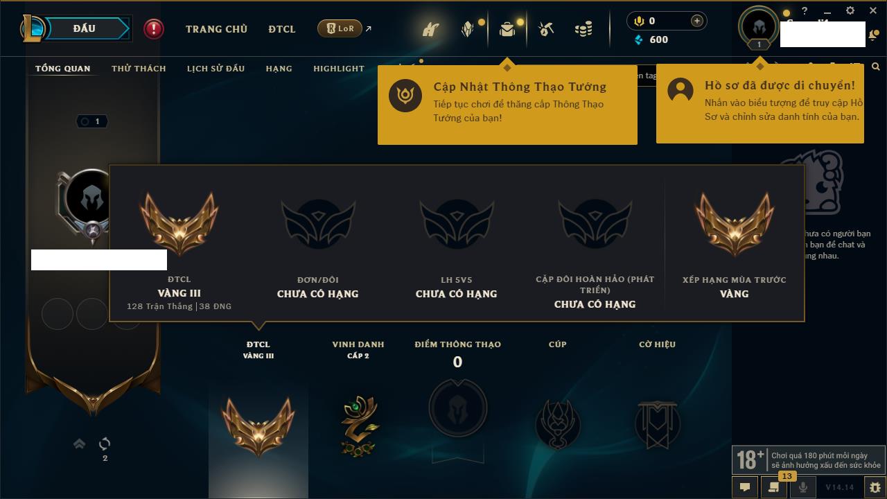 Rank Đơn: Chưa rank mùa nàoKhung: Chưa có khungTướng: 0 - Còn 600 THXTrang Phục: 0Rank ĐTCL: Chưa RankLinh Thú: 21