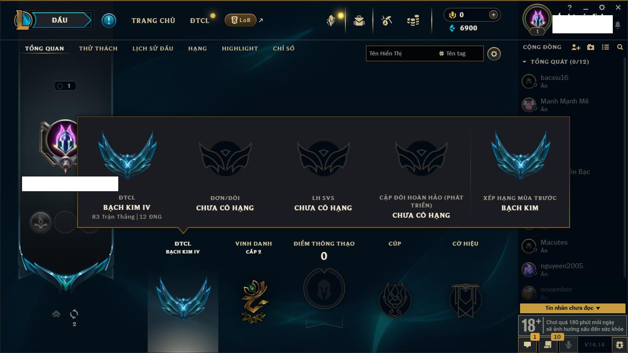 Rank Đơn: Chưa rank mùa nàoKhung: Chưa có khungTướng: 0 - Còn 6299 THXTrang Phục: 0Rank ĐTCL: Chưa RankLinh Thú: 8