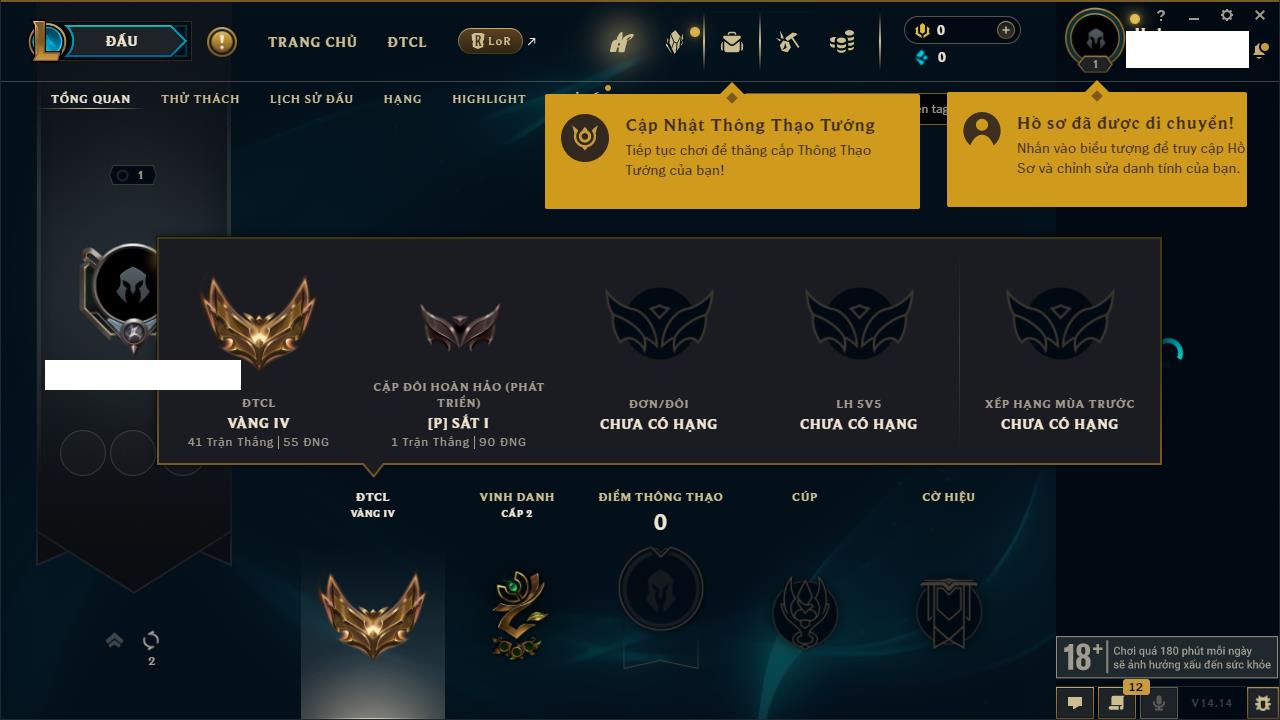 Rank Đơn: Chưa rank mùa nàoKhung: Chưa có khungTướng: 0 - Còn 600 THXTrang Phục: 0Rank ĐTCL: Chưa RankLinh Thú: 19
