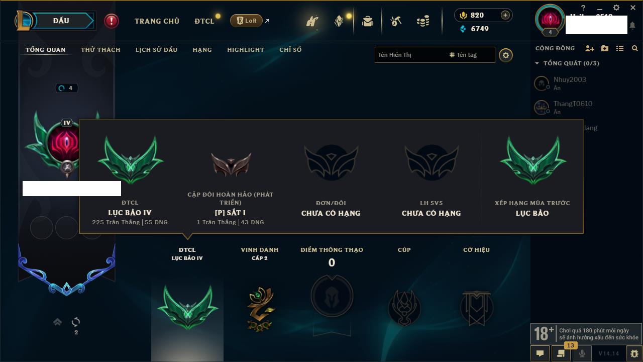 Rank Đơn: Chưa rank mùa nàoKhung: Chưa có khungTướng: 0 - Còn 3000 THXTrang Phục: 0Rank ĐTCL: Bạch Kim IVLinh Thú: 11