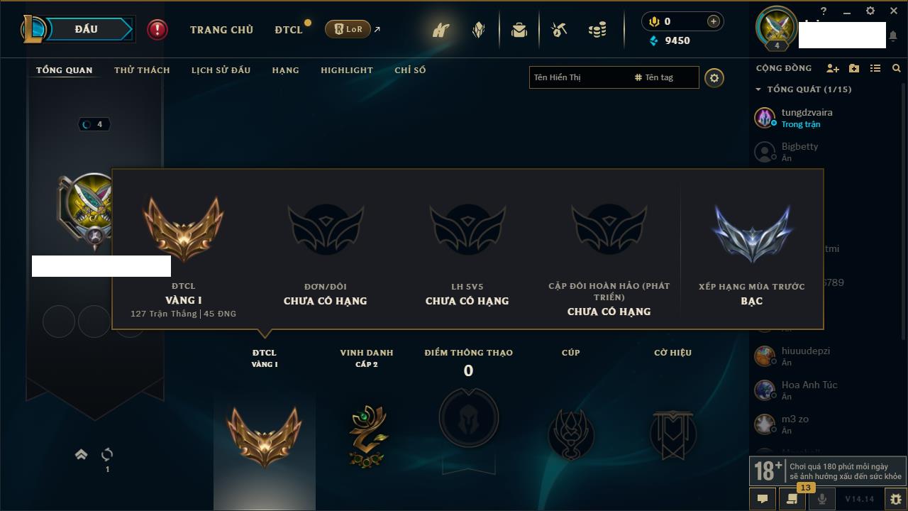 Rank Đơn: Chưa rank mùa nàoKhung: Chưa có khungTướng: 0 - Còn 3000 THXTrang Phục: 0Rank ĐTCL: Bạch Kim IVLinh Thú: 11