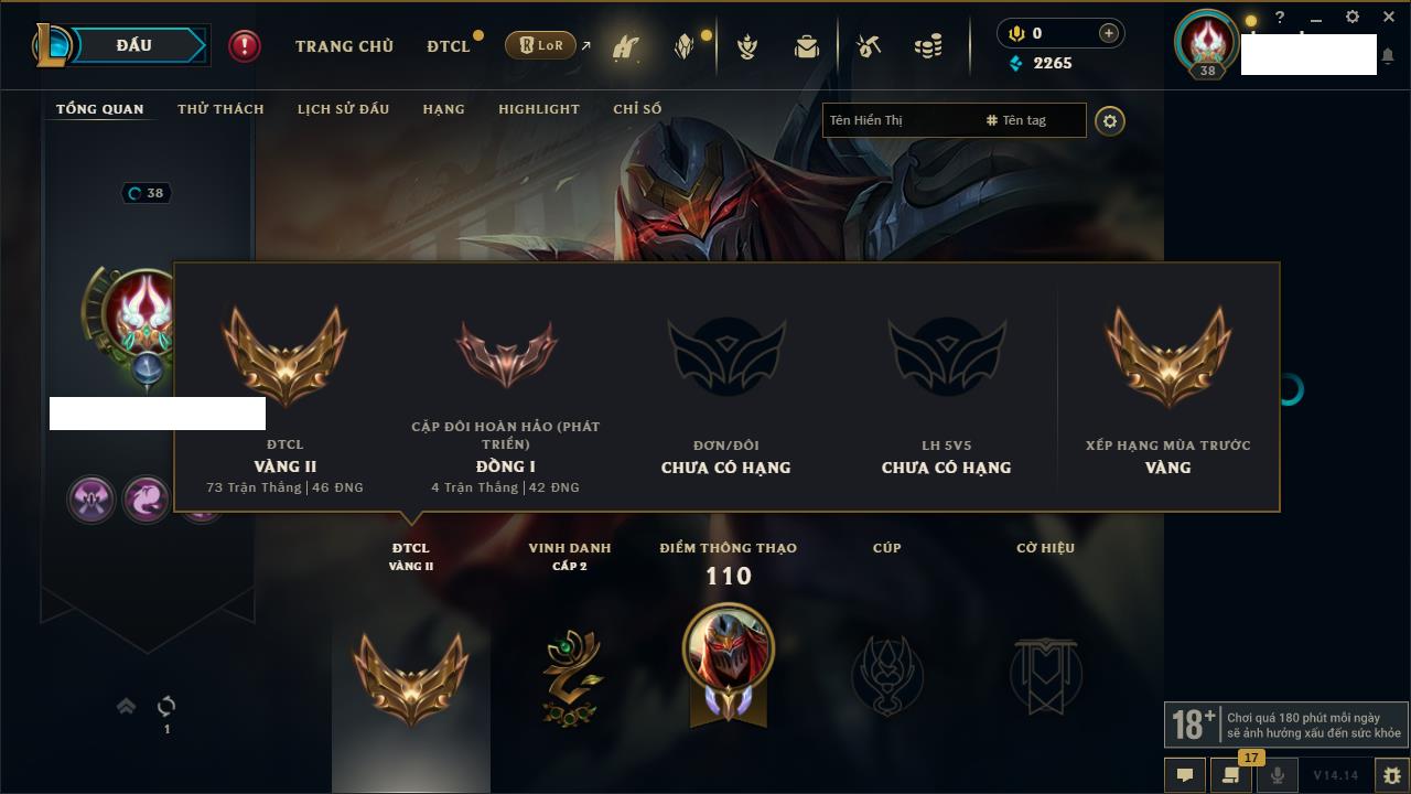 Rank Đơn: Bạc IIKhung: VàngTướng: 171 - Còn 332462 THXTrang Phục: 165Rank ĐTCL: Kim Cương IVLinh Thú: 181