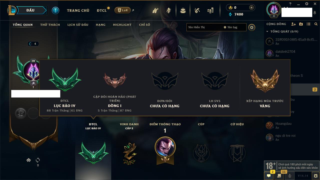 Rank Đơn: Chưa rank mùa nàoKhung: Chưa có khungTướng: 7 - Còn 24800 THXTrang Phục: 0Rank ĐTCL: Bạch Kim IVLinh Thú: 19