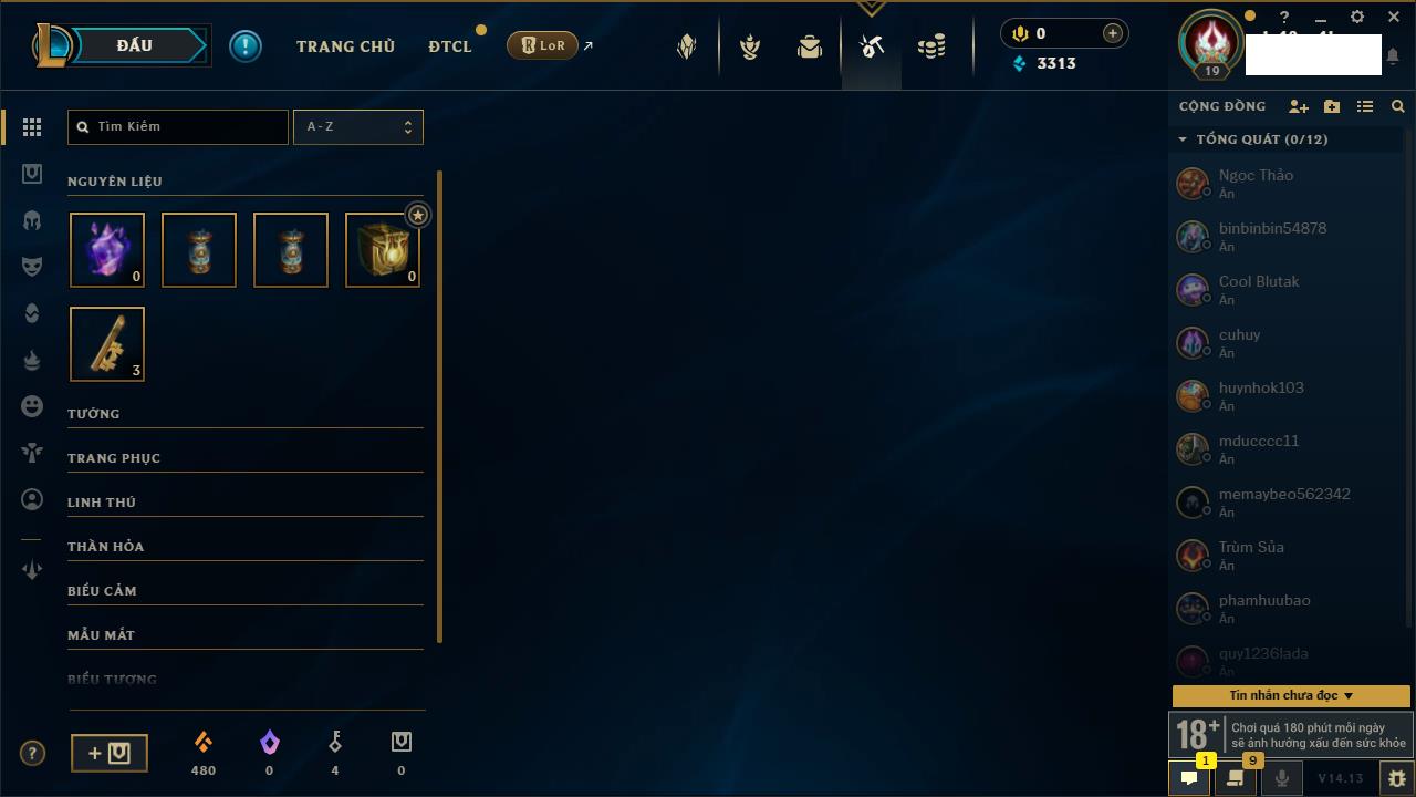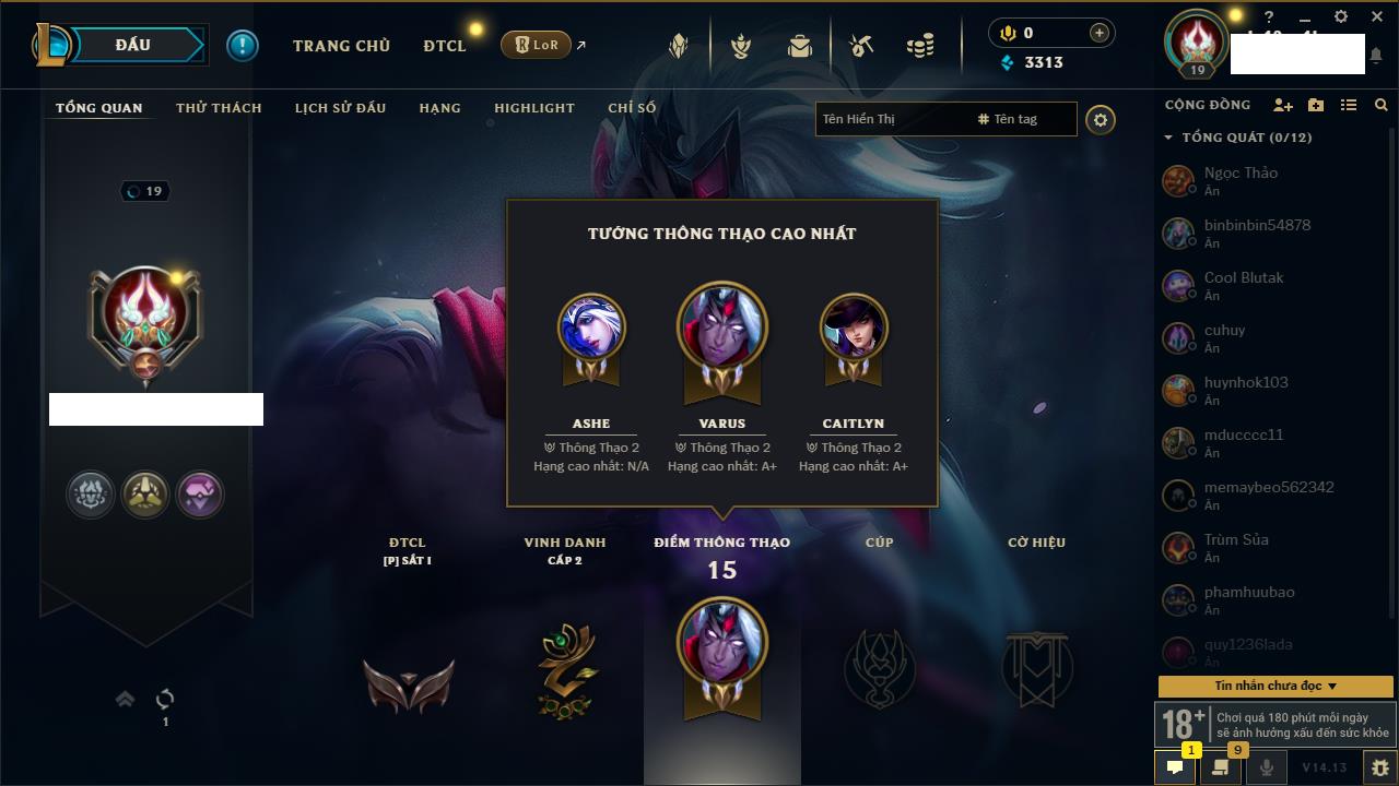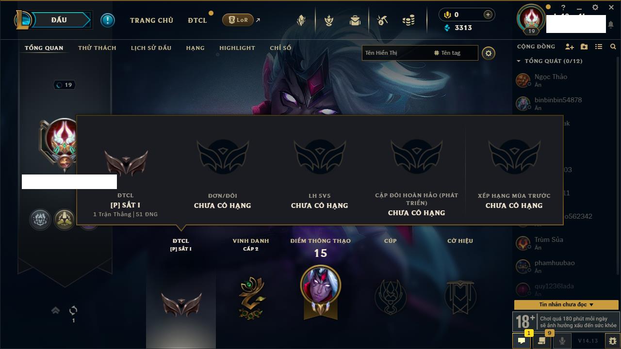 Rank Đơn: Vàng IIIKhung: BạcTướng: 171 - Còn 101359 THXTrang Phục: 88Rank ĐTCL: Kim Cương IVLinh Thú: 200