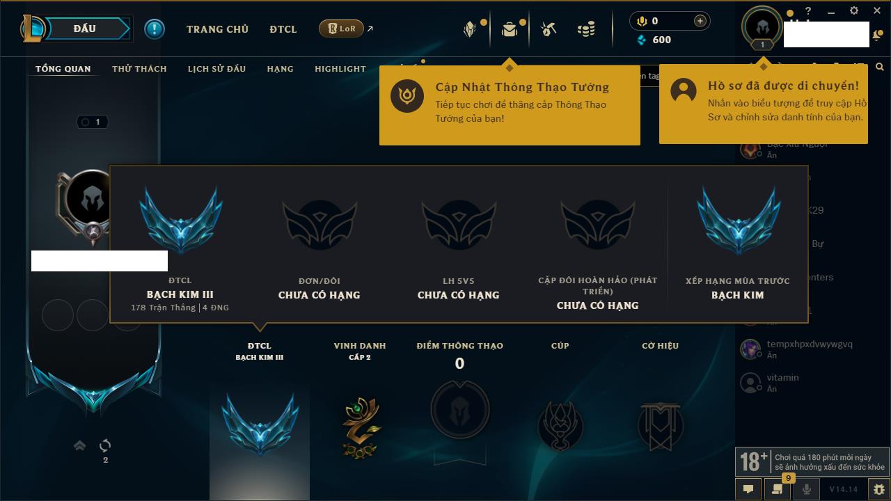 Rank Đơn: Chưa rank mùa nàoKhung: Chưa có khungTướng: 4 - Còn 12000 THXTrang Phục: 0Rank ĐTCL: Bạch Kim IIILinh Thú: 20