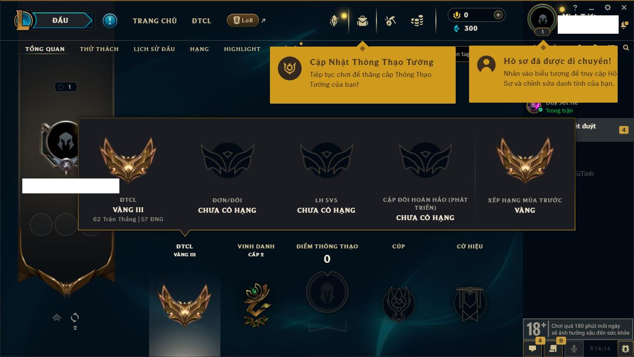 Rank Đơn: Chưa rank mùa nàoKhung: Chưa có khungTướng: 0 - Còn 6299 THXTrang Phục: 0Rank ĐTCL: Chưa RankLinh Thú: 8