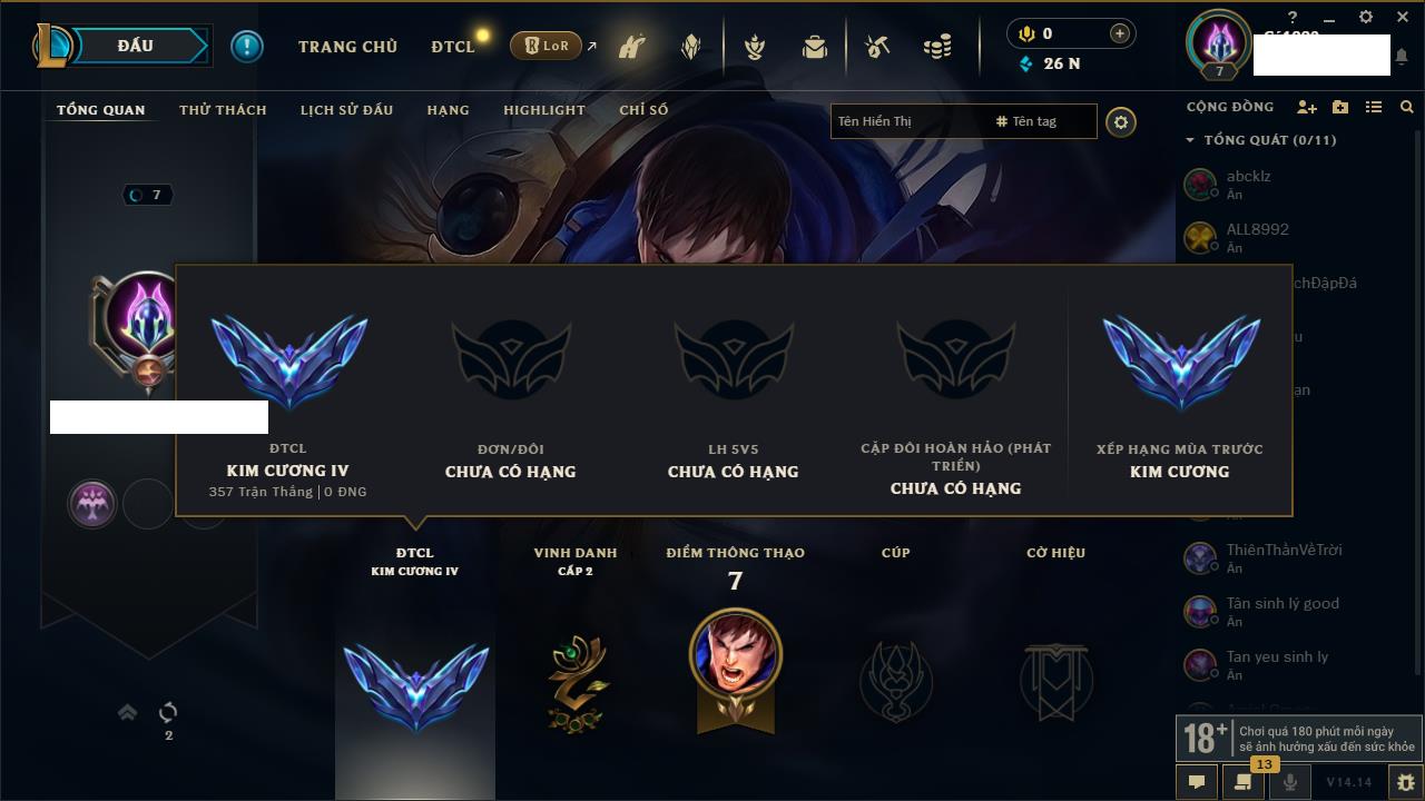 Rank Đơn: Chưa rank mùa nàoKhung: Chưa có khungTướng: 2 - Còn 9000 THXTrang Phục: 0Rank ĐTCL: Bạch Kim IIILinh Thú: 31