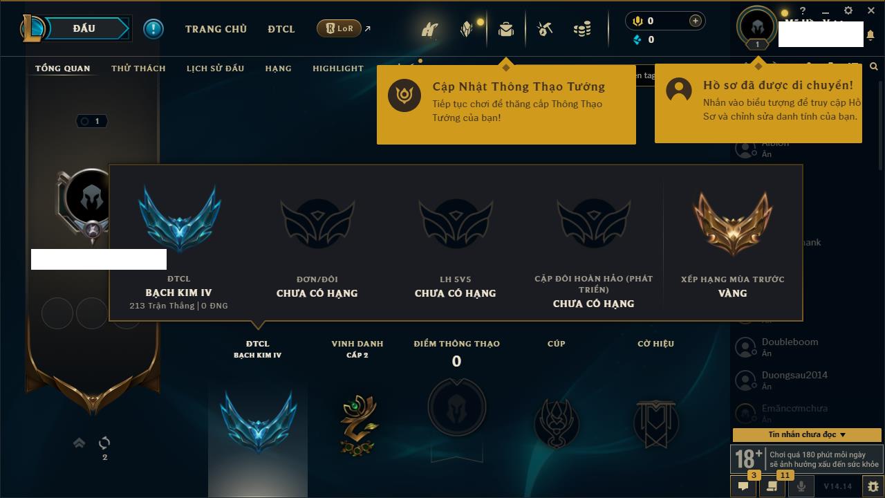Rank Đơn: Chưa rank mùa nào Khung: Chưa có khung Tướng: 0 - Còn 600 THX Trang Phục: 0 Rank ĐTCL: Chưa Rank Linh Thú: 20