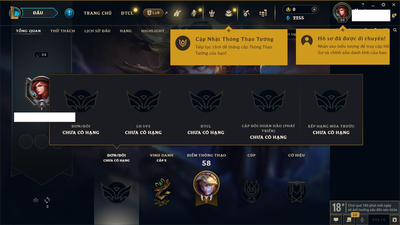 Rank Đơn: Chưa rank mùa nàoKhung: Chưa có khungTướng: 38 - Còn 6280 THXTrang Phục: 2Rank ĐTCL: Chưa RankLinh Thú: 50