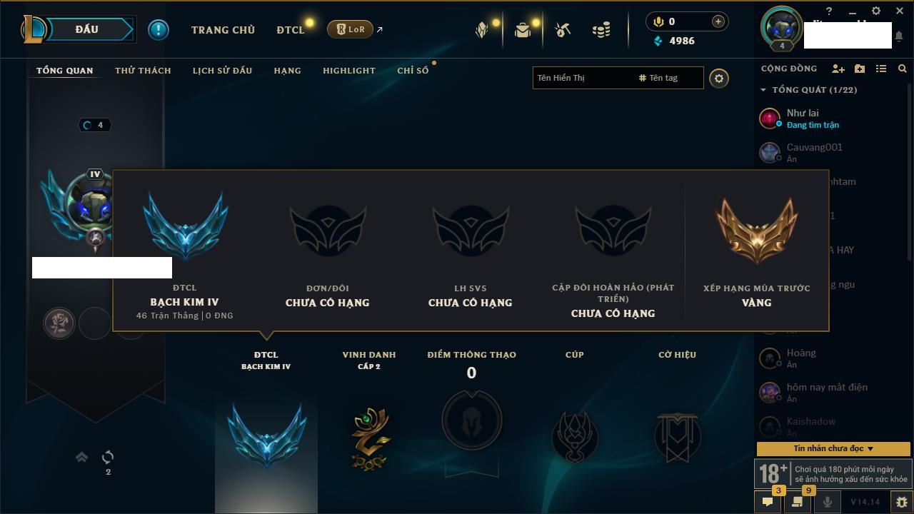 Rank Đơn: Đồng IVKhung: ĐồngTướng: 172 - Còn 66370 THXTrang Phục: 49Rank ĐTCL: Bạch Kim ILinh Thú: 243