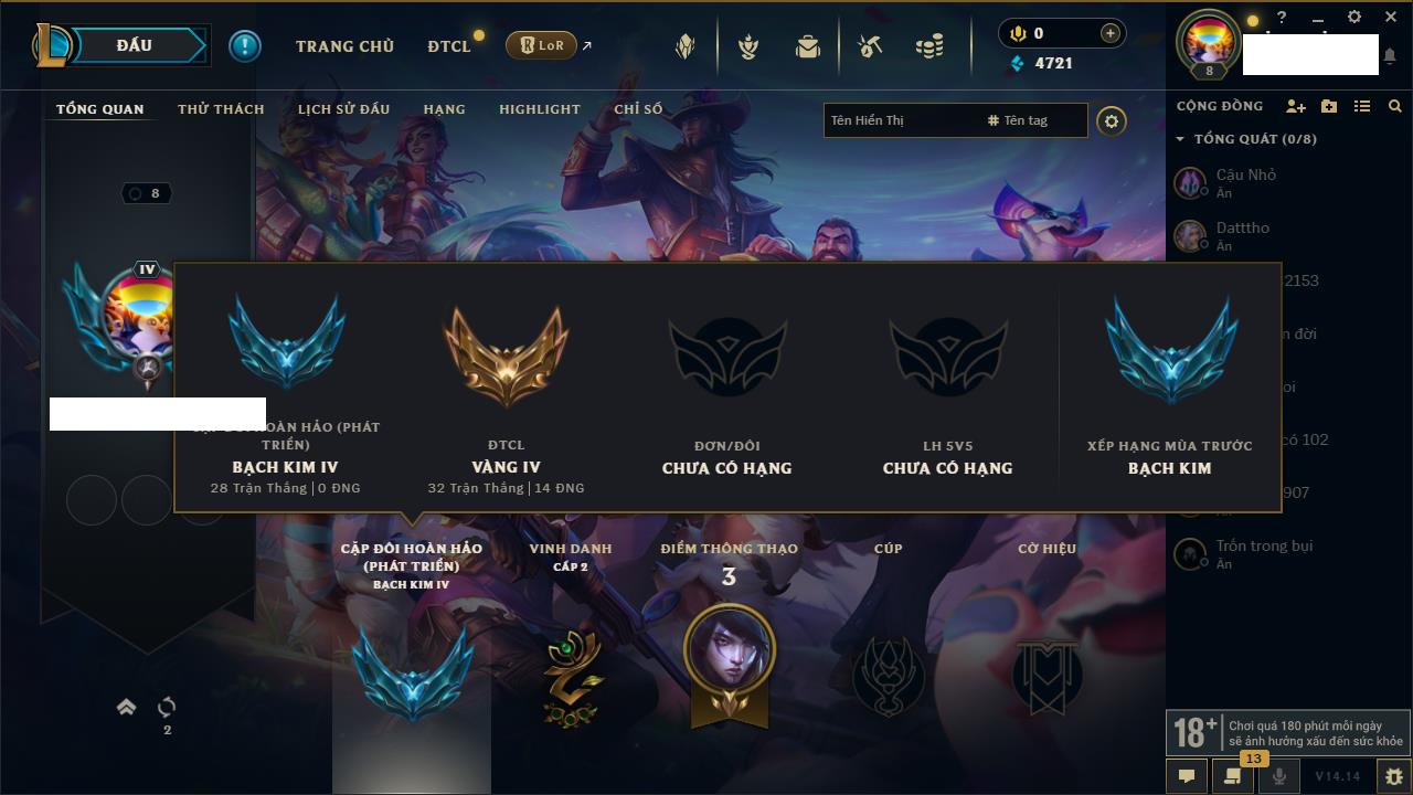 Rank Đơn: Chưa rank mùa nàoKhung: Chưa có khungTướng: 0 - Còn 3000 THXTrang Phục: 0Rank ĐTCL: Bạch Kim IVLinh Thú: 11