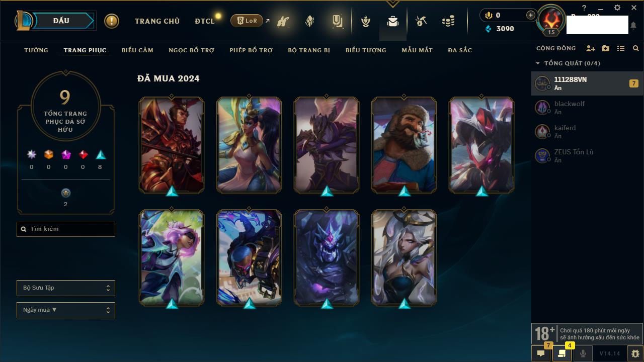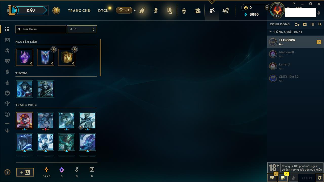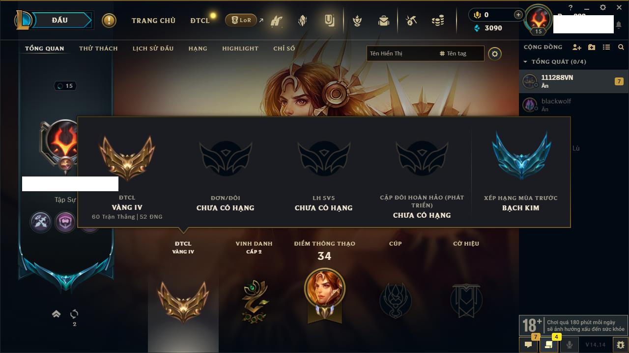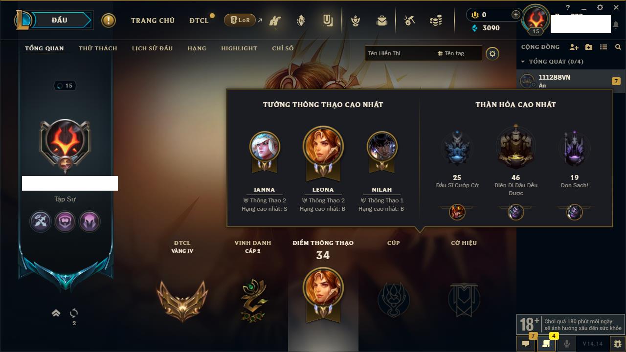 Rank Đơn: Chưa rank mùa nào Khung: Chưa có khung Tướng: 166 - Còn 3090 THX Trang Phục: 9 Rank ĐTCL: Chưa Rank Linh Thú: 125