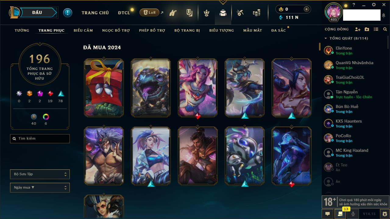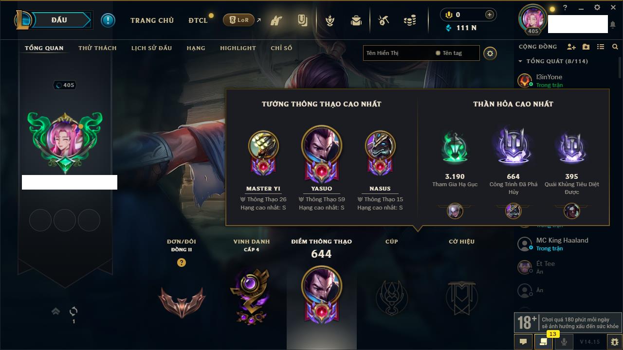 Rank Đơn: Đồng IIIKhung: Chưa có khungTướng: 152 - Còn 6423 THXTrang Phục: 160Rank ĐTCL: Chưa RankLinh Thú: 107