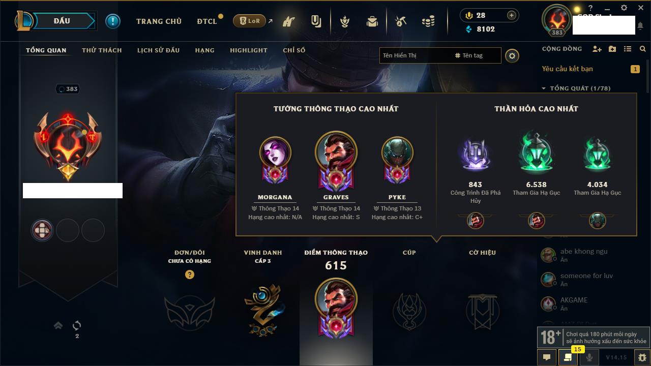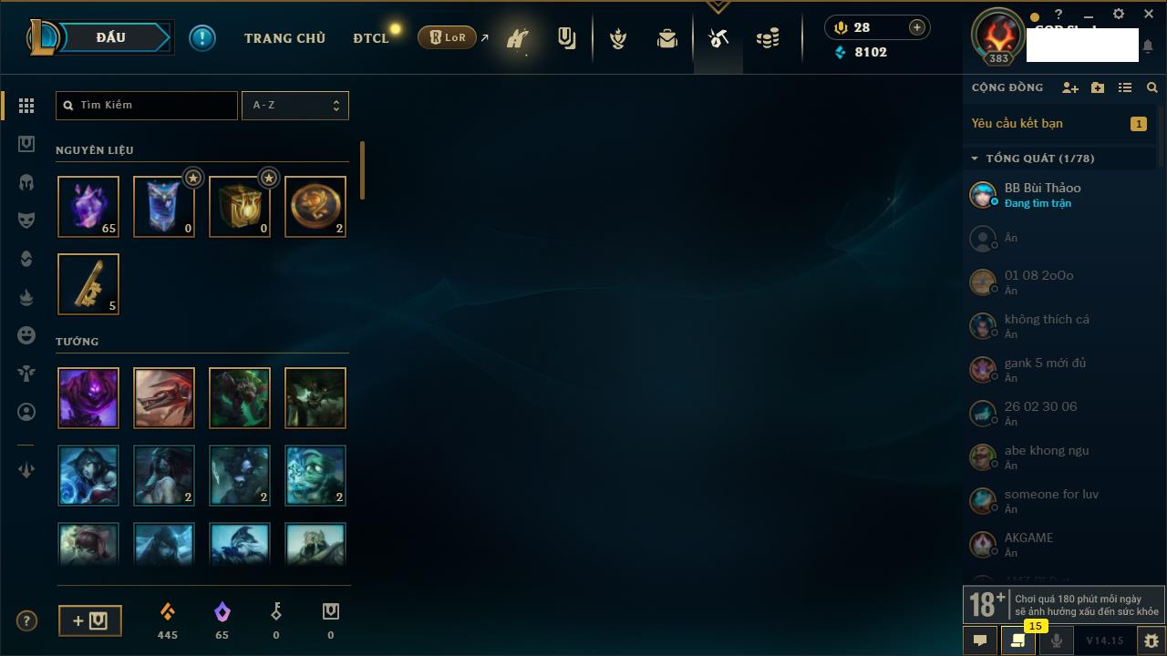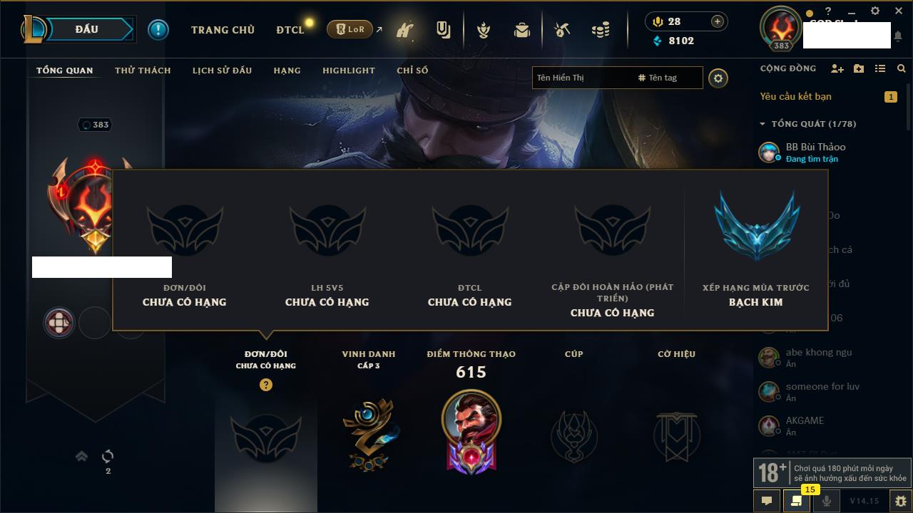 Rank Đơn: Bạc IVKhung: BạcTướng: 171 - Còn 263852 THXTrang Phục: 384Rank ĐTCL: Bạch Kim IIILinh Thú: 125