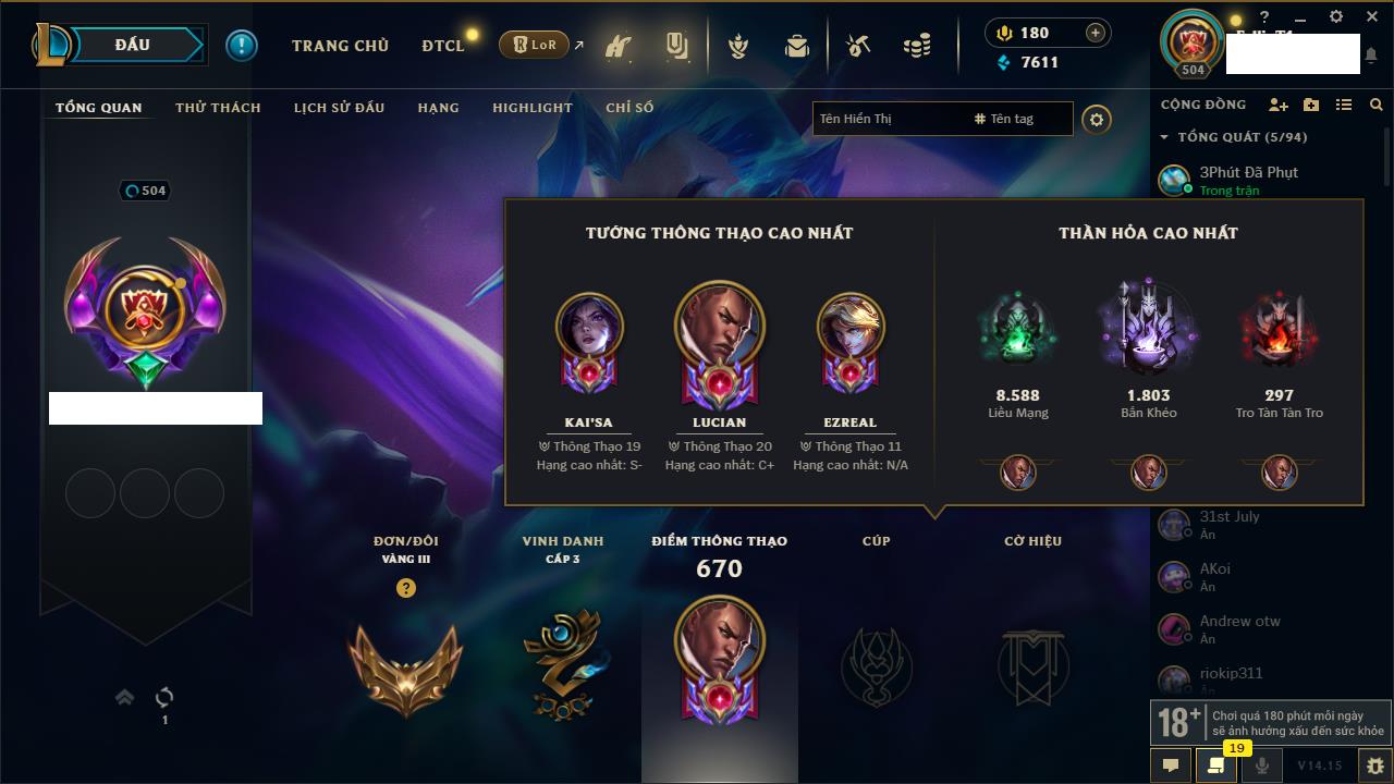 Rank Đơn: Vàng IIIKhung: VàngTướng: 171 - Còn 88128 THXTrang Phục: 329Rank ĐTCL: Chưa RankLinh Thú: 41