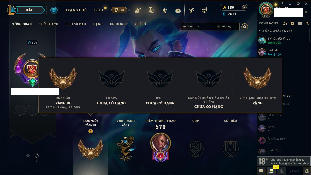 Rank Đơn: Vàng IIIKhung: VàngTướng: 171 - Còn 224994 THXTrang Phục: 273Rank ĐTCL: Vàng IVLinh Thú: 192