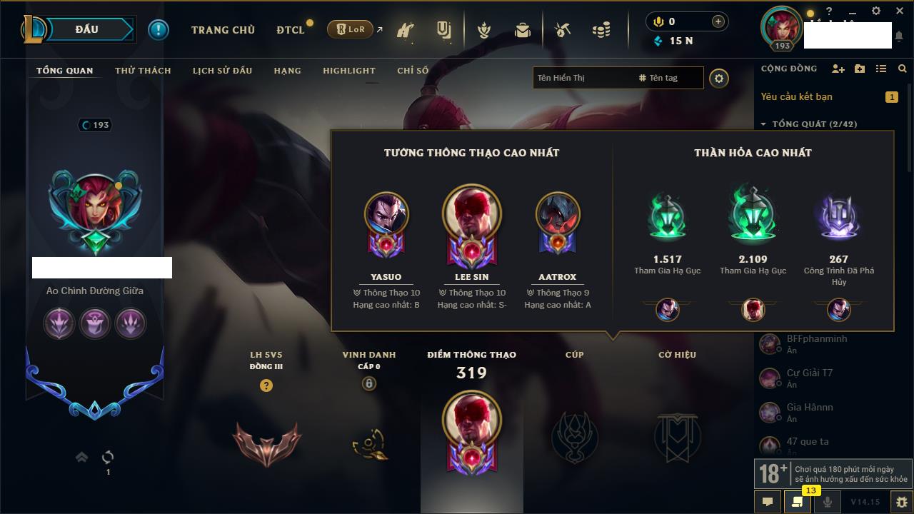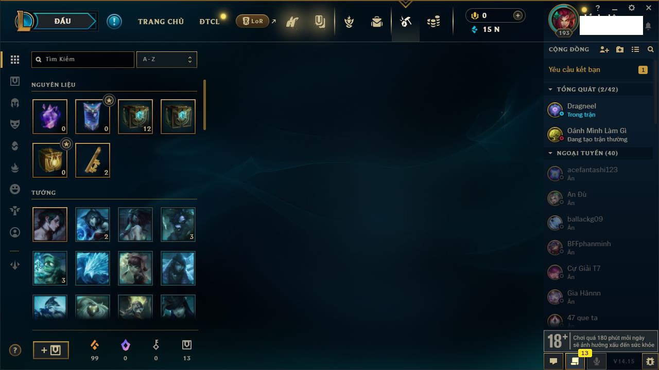 Rank Đơn: Chưa RankKhung: Chưa có khungTướng: 170 - Còn 13795 THXTrang Phục: 75Rank ĐTCL: Chưa RankLinh Thú: 176