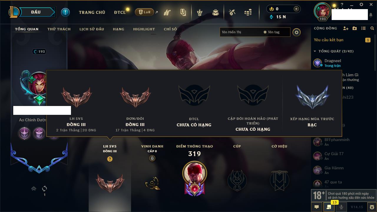 Rank Đơn: Chưa RankKhung: Chưa có khungTướng: 65 - Còn 2075 THXTrang Phục: 10Rank ĐTCL: Chưa RankLinh Thú: 72