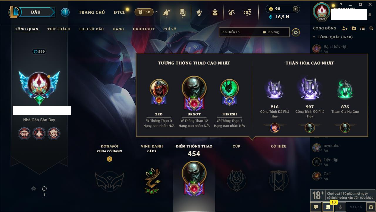 Rank Đơn: Vàng IKhung: Bạch kimTướng: 172 - Còn 108407 THXTrang Phục: 237Rank ĐTCL: Chưa RankLinh Thú: 44
