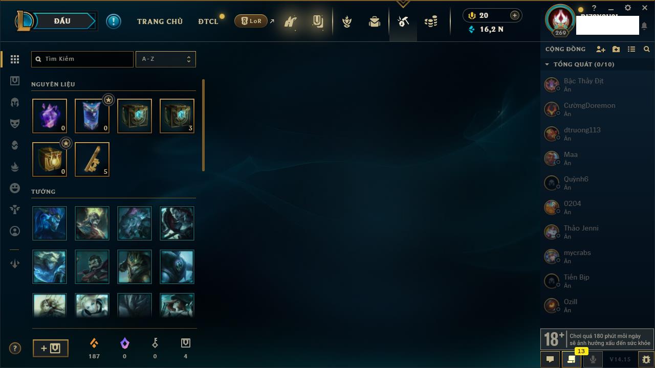 Rank Đơn: Lục Bảo IVKhung: Chưa có khungTướng: 171 - Còn 165973 THXTrang Phục: 160Rank ĐTCL: Chưa RankLinh Thú: 9