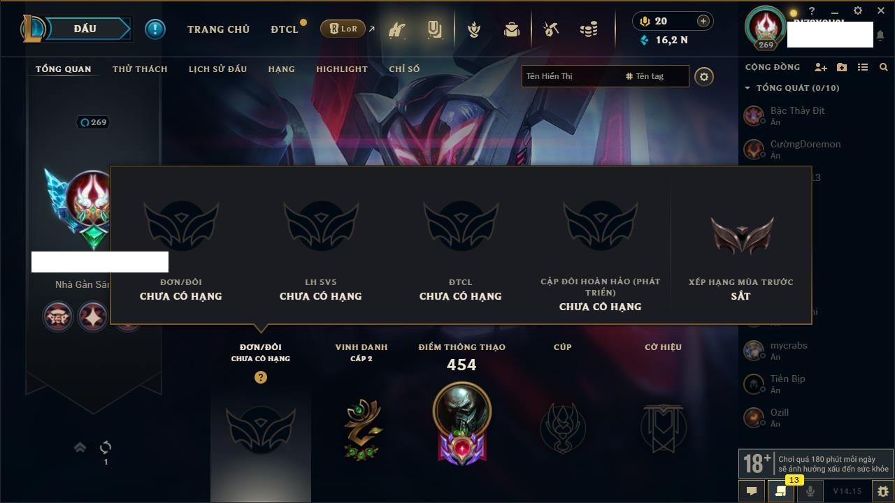 Rank Đơn: Bạc IIKhung: VàngTướng: 171 - Còn 70460 THXTrang Phục: 169Rank ĐTCL: Vàng ILinh Thú: 46