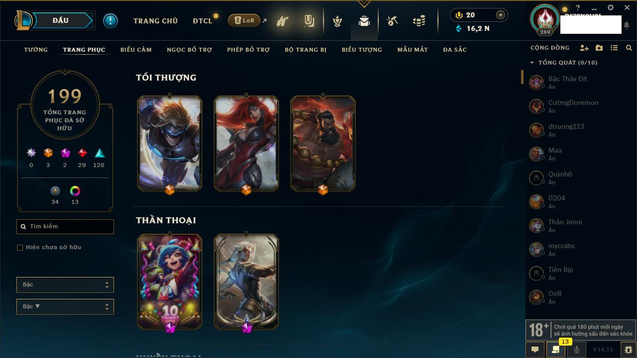 Rank Đơn: Vàng IIIKhung: VàngTướng: 161 - Còn 162202 THXTrang Phục: 179Rank ĐTCL: Chưa RankLinh Thú: 20