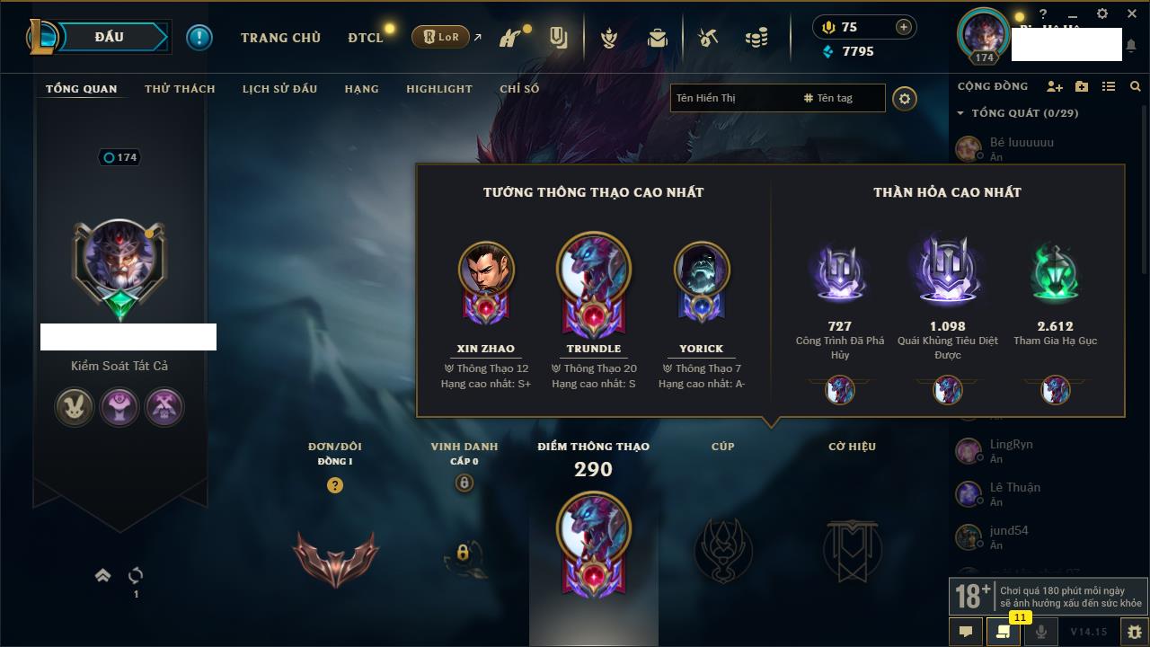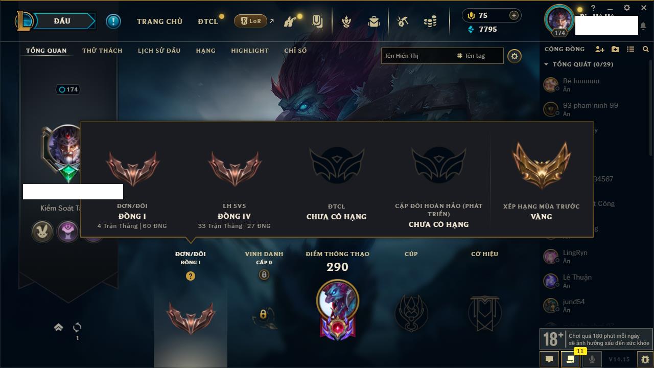 Rank Đơn: Đồng IKhung: Chưa có khungTướng: 130 - Còn 4038 THXTrang Phục: 151Rank ĐTCL: Chưa RankLinh Thú: 45