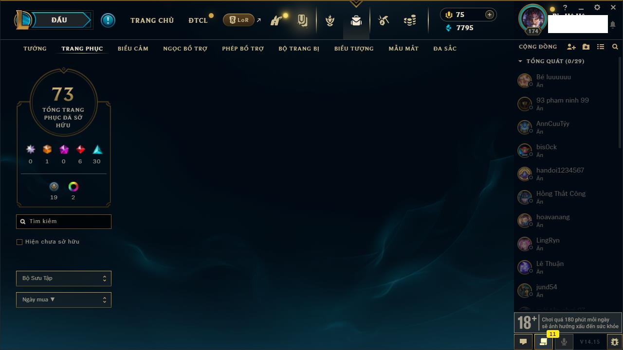 Rank Đơn: Chưa RankKhung: Chưa có khungTướng: 76 - Còn 3157 THXTrang Phục: 7Rank ĐTCL: Chưa RankLinh Thú: 100