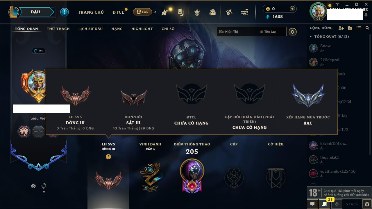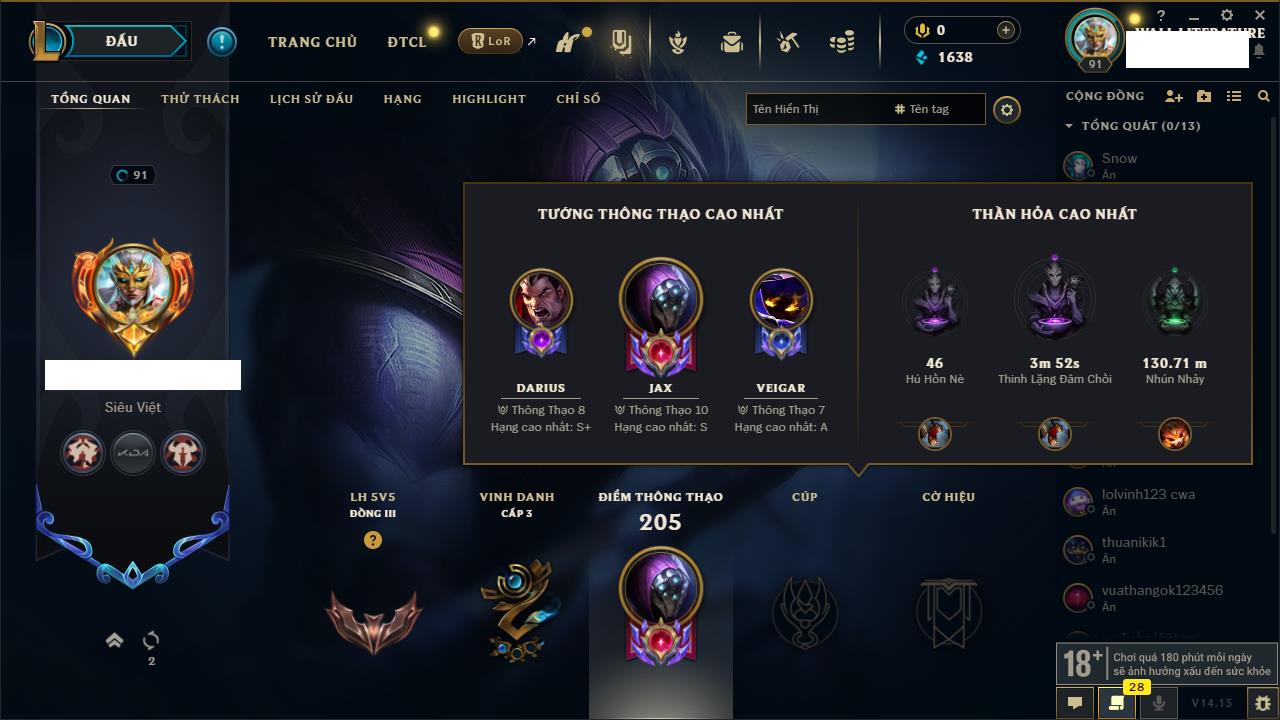 Rank Đơn: Chưa RankKhung: Chưa có khungTướng: 3 - Còn 34550 THXTrang Phục: 0Rank ĐTCL: Chưa RankLinh Thú: 41