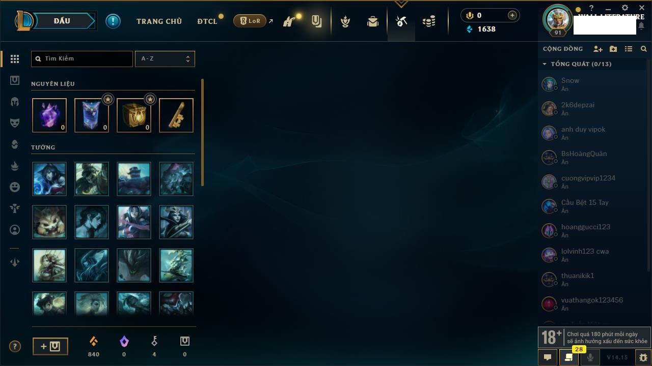Rank Đơn: Chưa RankKhung: Chưa có khungTướng: 79 - Còn 2490 THXTrang Phục: 2Rank ĐTCL: Chưa RankLinh Thú: 26
