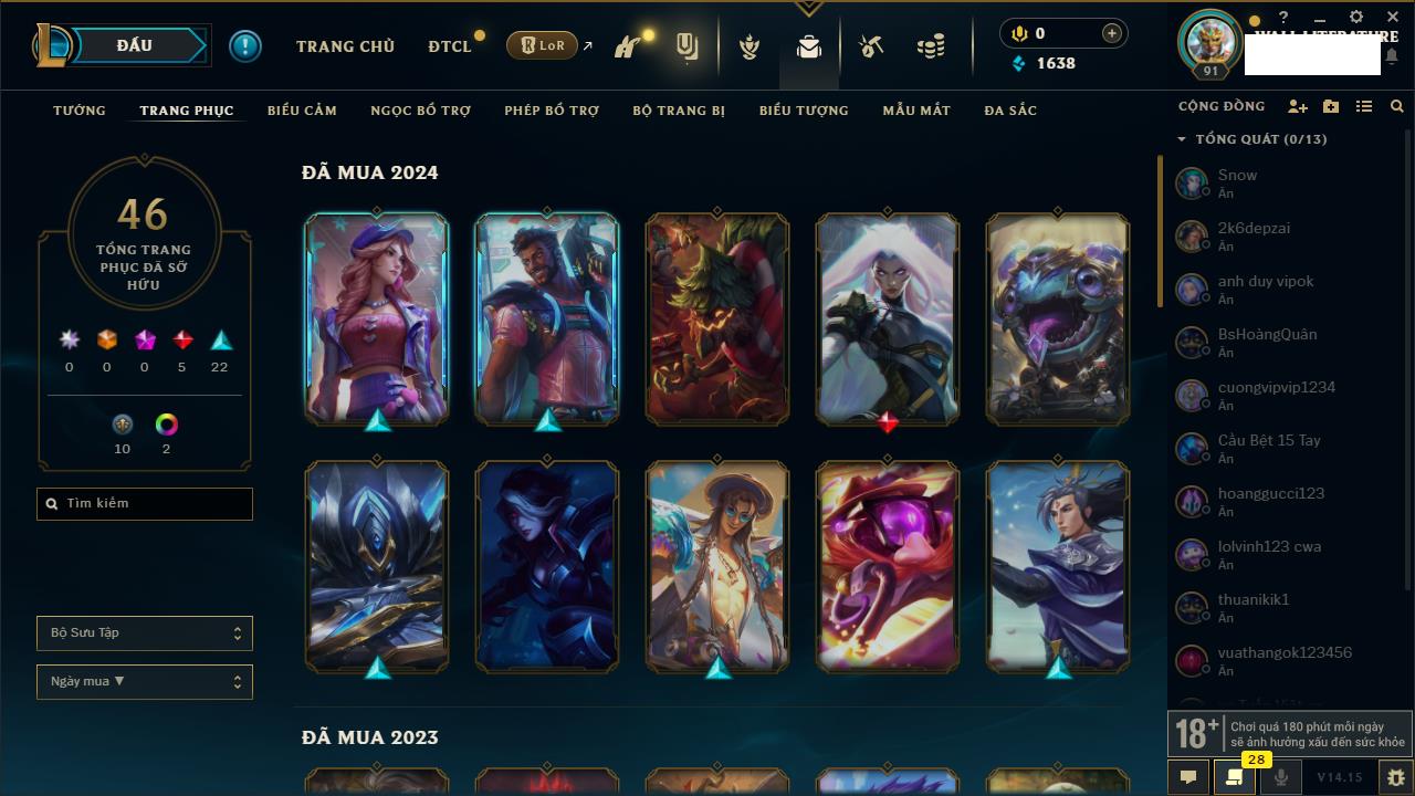 Rank Đơn: Chưa RankKhung: Chưa có khungTướng: 0 - Còn 2000 THXTrang Phục: 0Rank ĐTCL: Chưa RankLinh Thú: 24