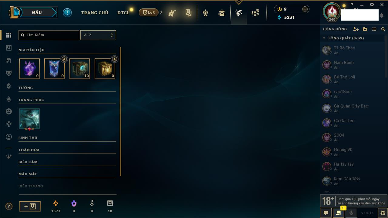 Rank Đơn: Chưa RankKhung: Chưa có khungTướng: 65 - Còn 2075 THXTrang Phục: 10Rank ĐTCL: Chưa RankLinh Thú: 72