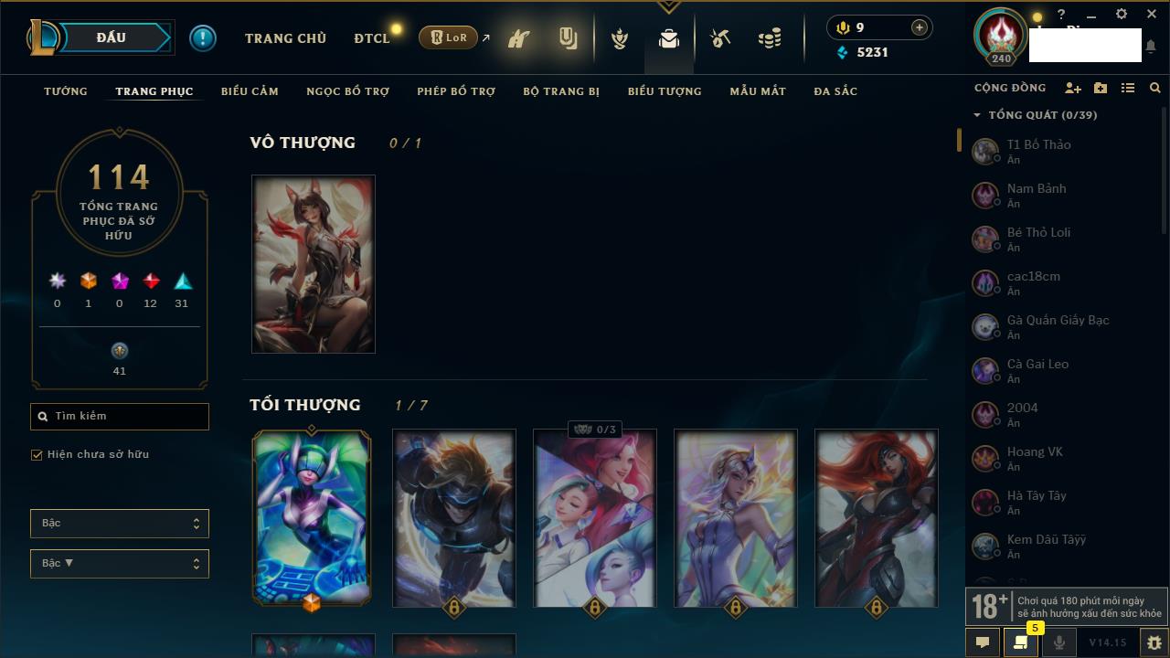 Rank Đơn: Chưa RankKhung: Chưa có khungTướng: 170 - Còn 13795 THXTrang Phục: 75Rank ĐTCL: Chưa RankLinh Thú: 176