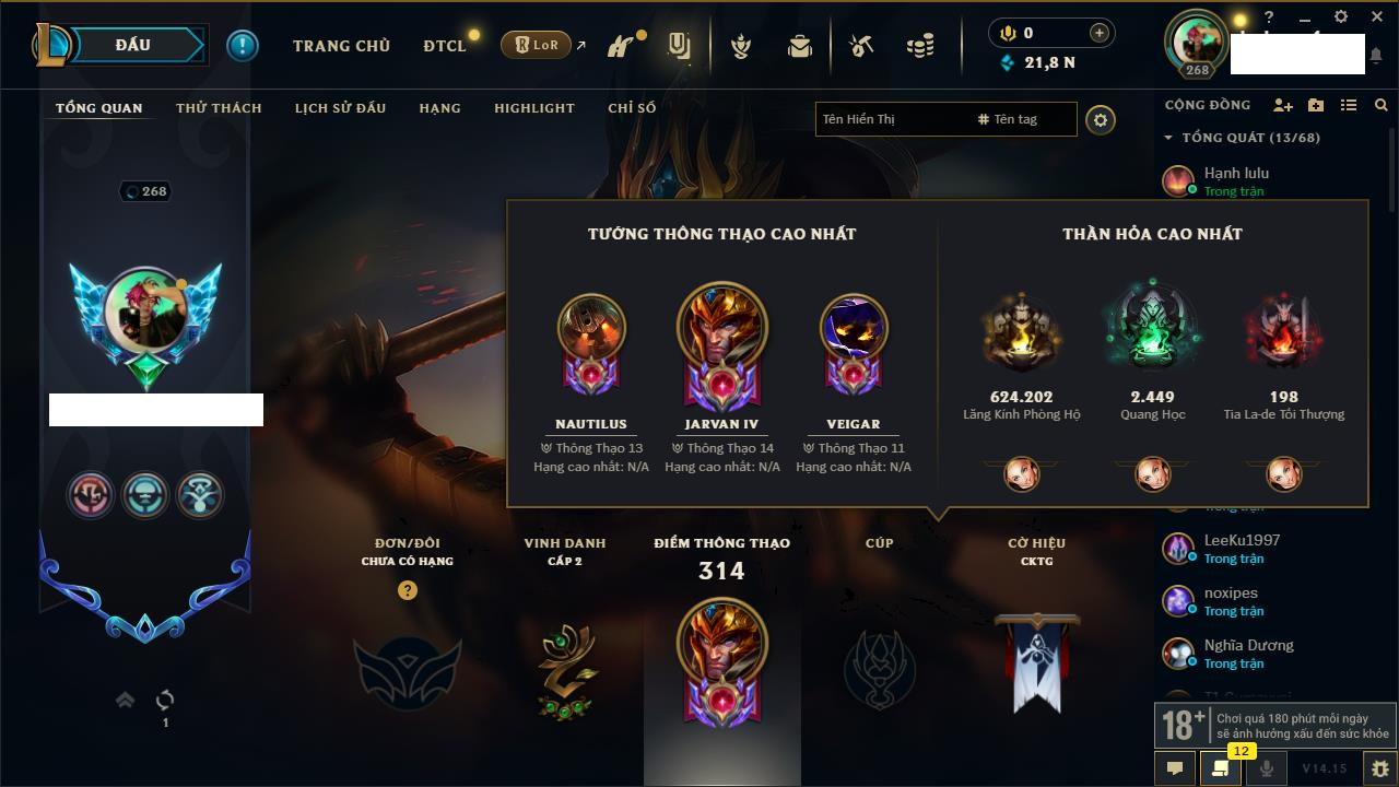Rank Đơn: Chưa RankKhung: Chưa có khungTướng: 161 - Còn 144228 THXTrang Phục: 179Rank ĐTCL: Chưa RankLinh Thú: 12