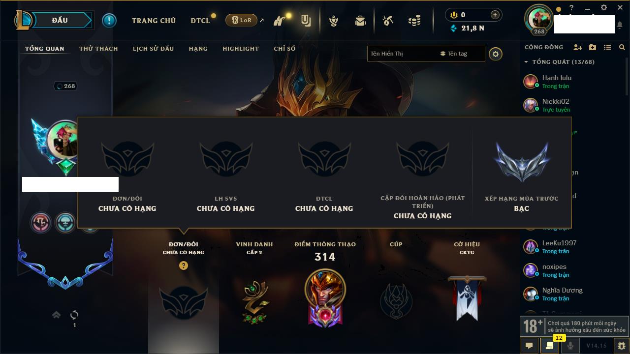Rank Đơn: Chưa RankKhung: Chưa có khungTướng: 65 - Còn 2075 THXTrang Phục: 10Rank ĐTCL: Chưa RankLinh Thú: 72