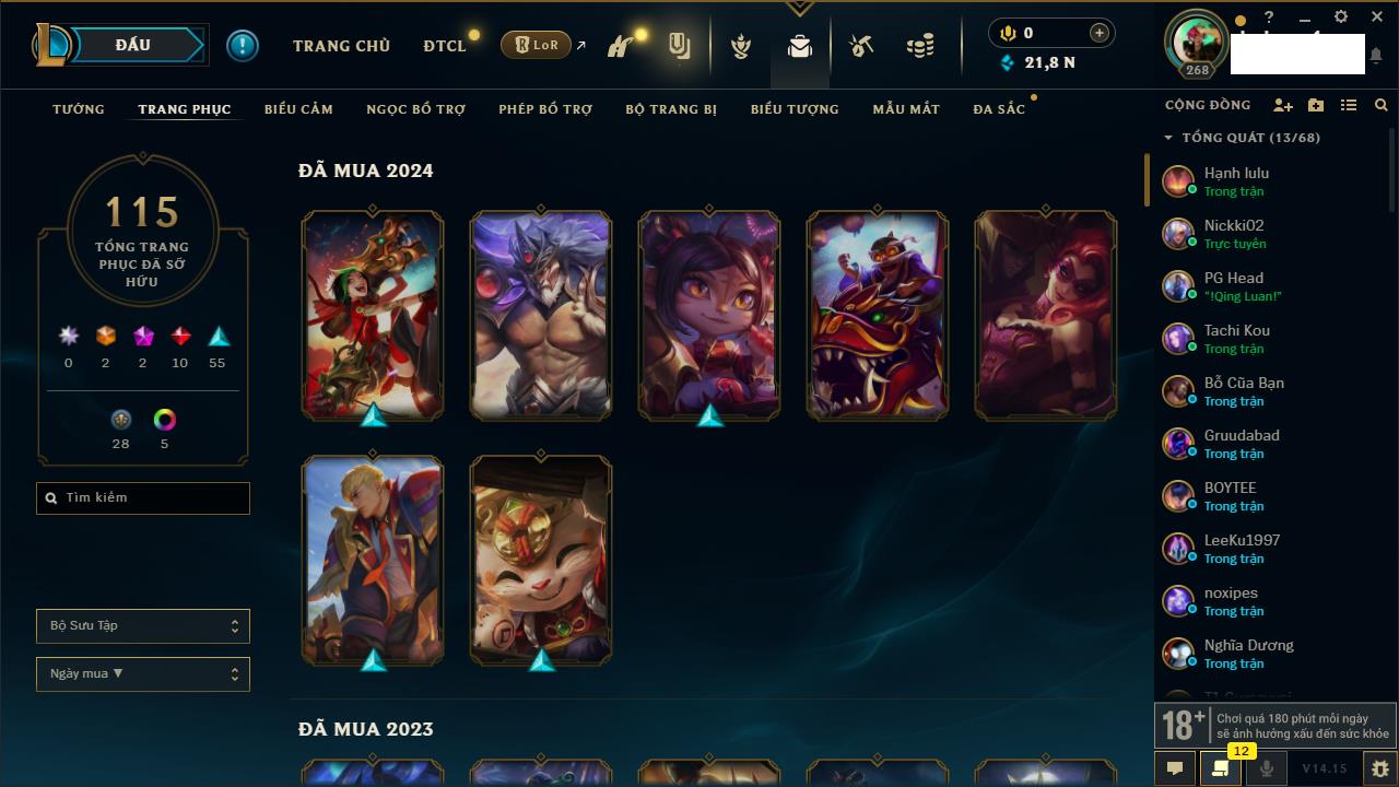 Rank Đơn: Chưa RankKhung: Chưa có khungTướng: 170 - Còn 13795 THXTrang Phục: 75Rank ĐTCL: Chưa RankLinh Thú: 176