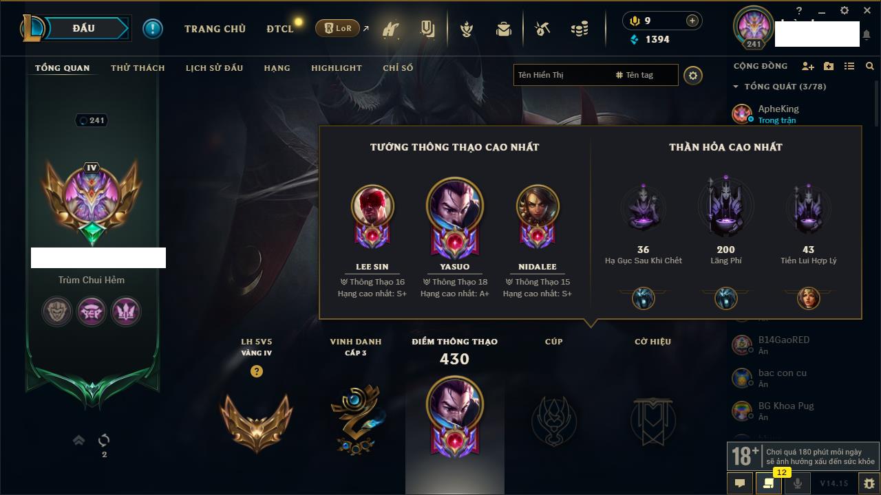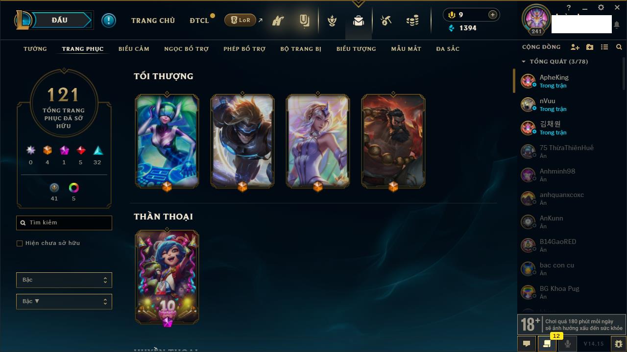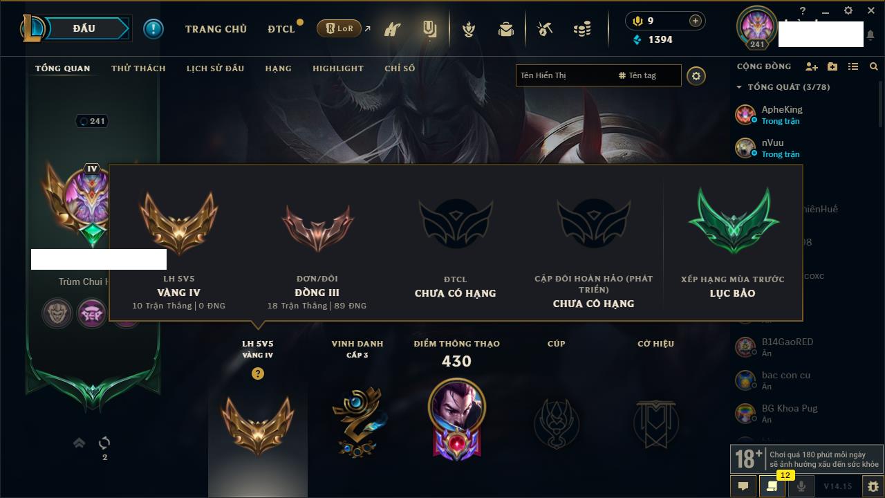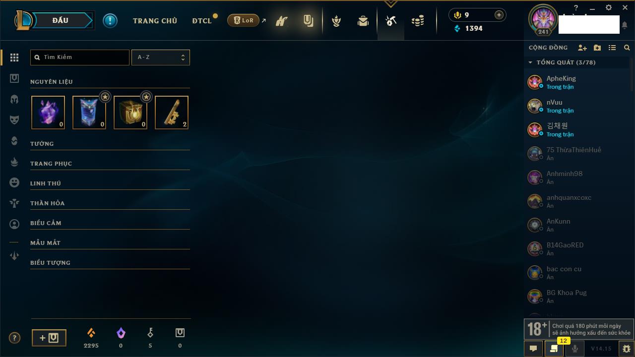 Rank Đơn: Chưa RankKhung: Chưa có khungTướng: 171 - Còn 164047 THXTrang Phục: 173Rank ĐTCL: Chưa RankLinh Thú: 77