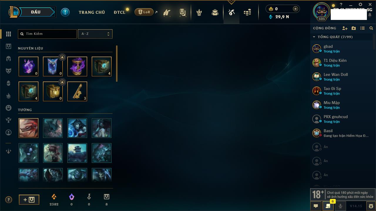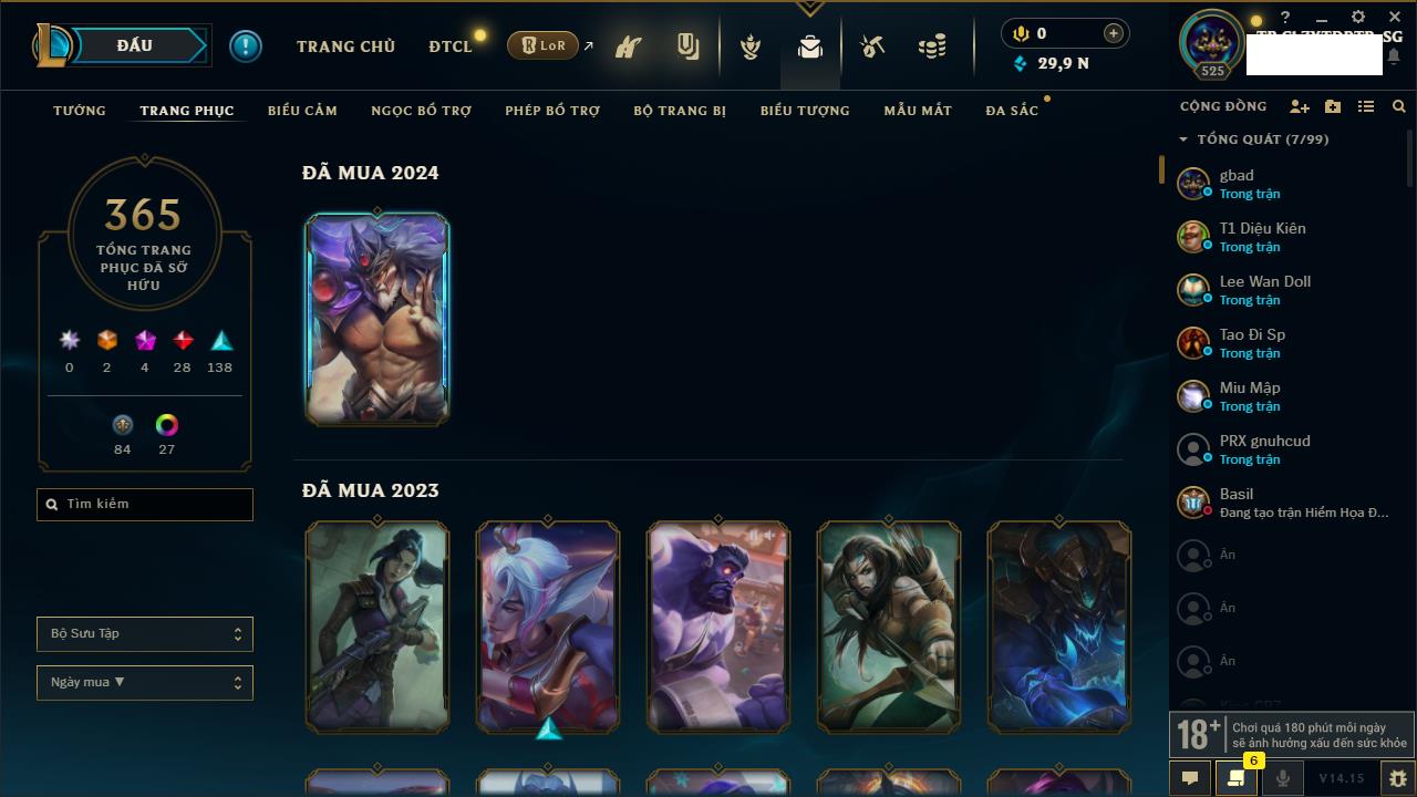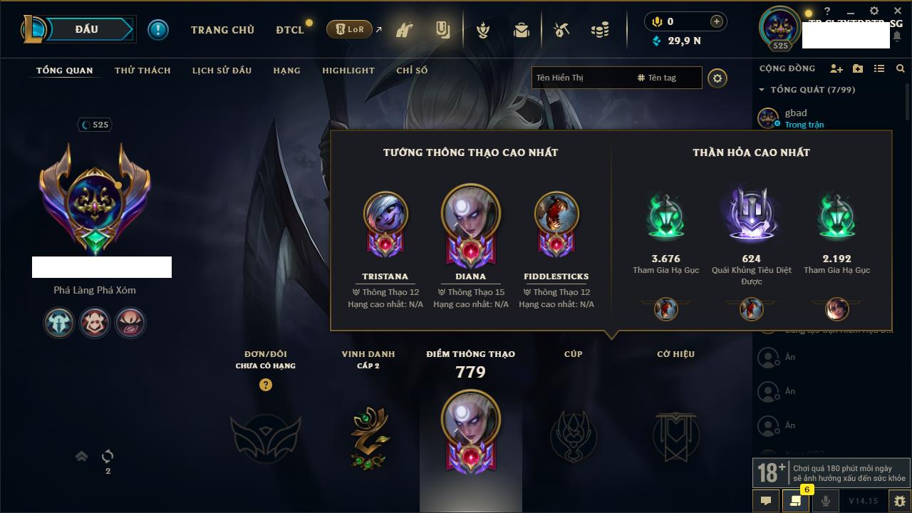 Rank Đơn: Chưa RankKhung: Bạch kimTướng: 171 - Còn 182788 THXTrang Phục: 158Rank ĐTCL: Chưa RankLinh Thú: 56