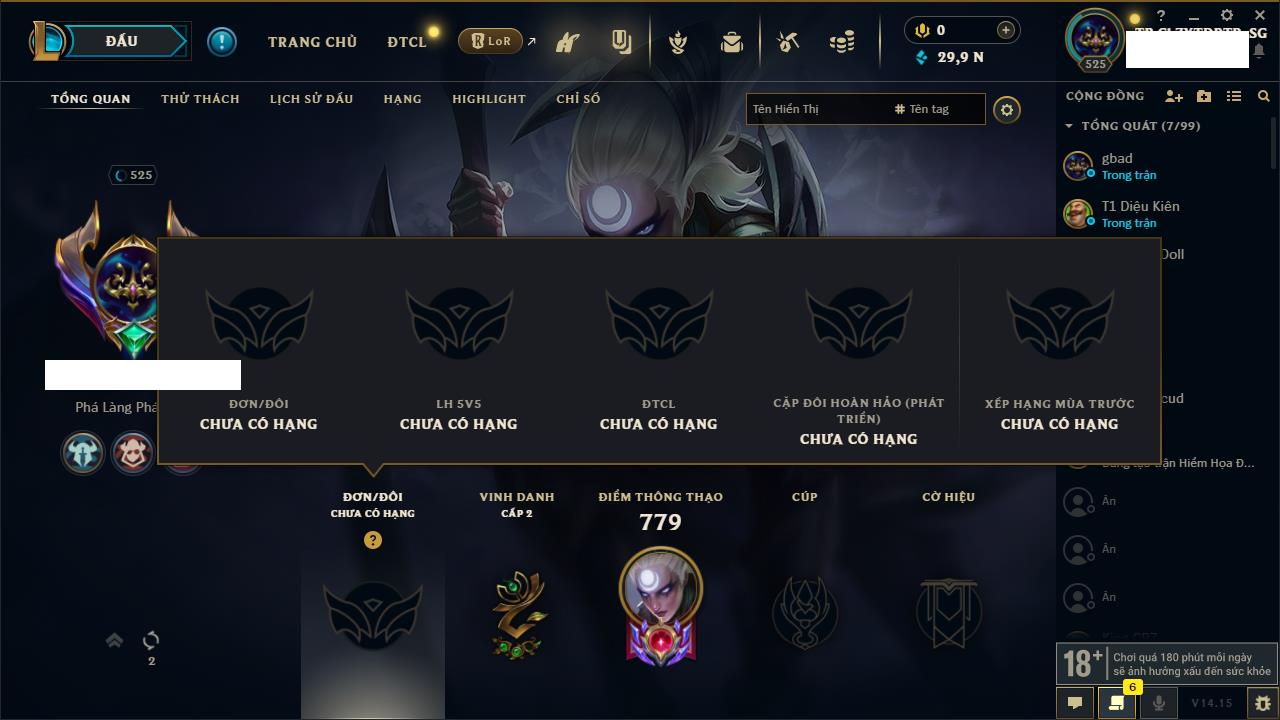 Rank Đơn: Chưa RankKhung: Chưa có khungTướng: 172 - Còn 31971 THXTrang Phục: 189Rank ĐTCL: Chưa RankLinh Thú: 144