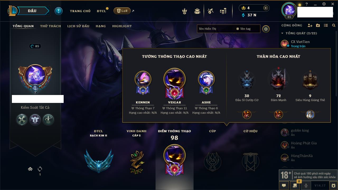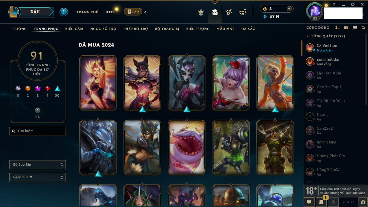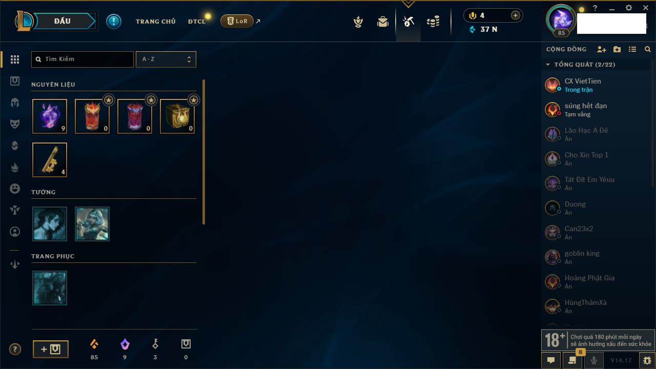 Rank Đơn: Chưa Rank Khung: Chưa có khung Tướng: 162 - Còn 7070 THX Trang Phục: 37 Rank ĐTCL: Chưa Rank Linh Thú: 73