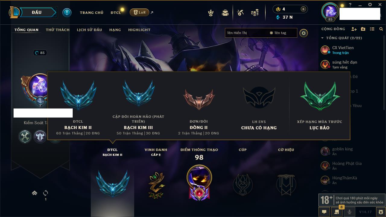 Rank Đơn: Chưa Rank Khung: Chưa có khung Tướng: 105 - Còn 9402 THX Trang Phục: 63 Rank ĐTCL: Chưa Rank Linh Thú: 91