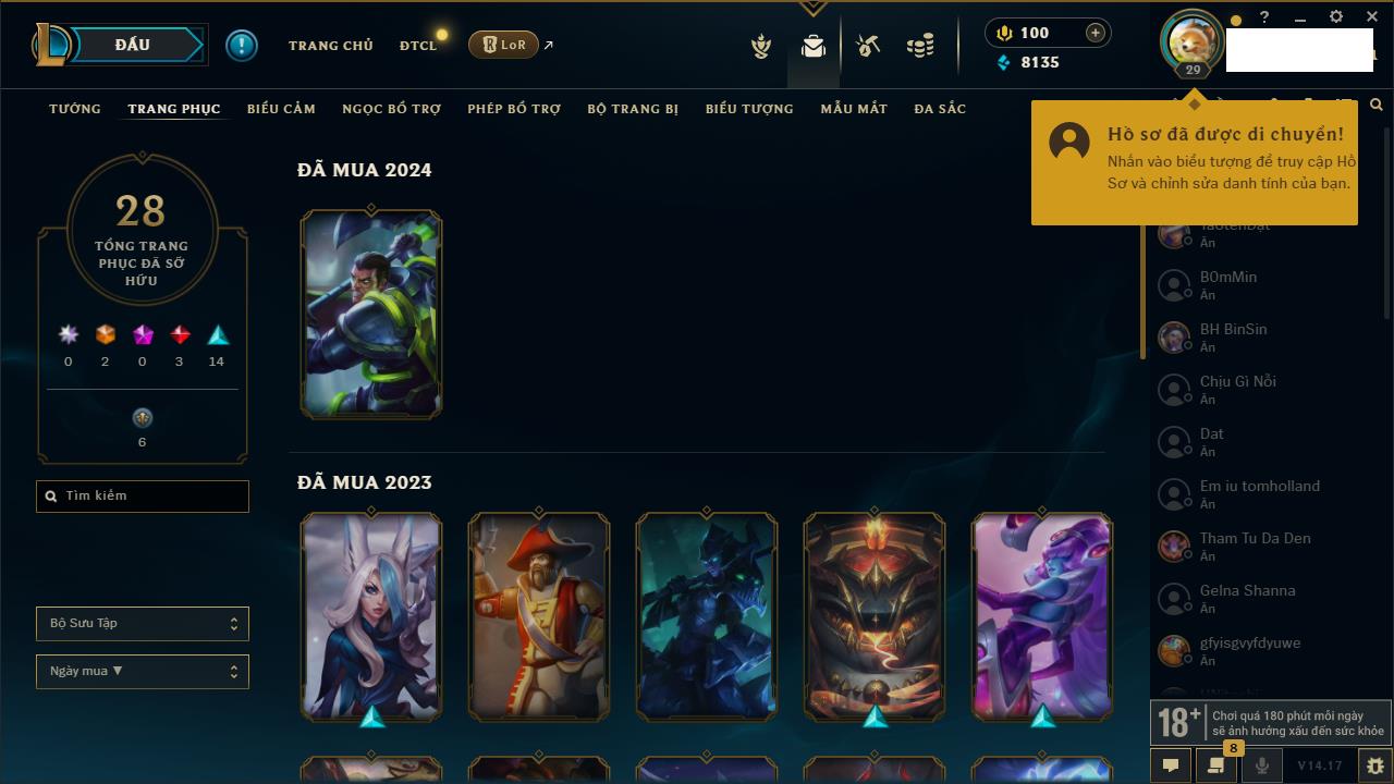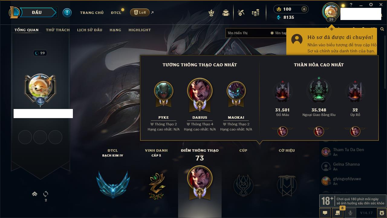 Rank Đơn: Vàng IIIKhung: BạcTướng: 56 - Còn 910 THXTrang Phục: 9Rank ĐTCL: Chưa RankLinh Thú: 31