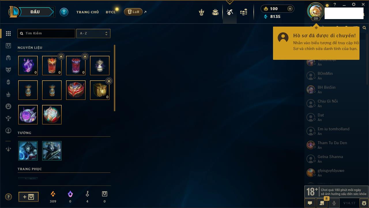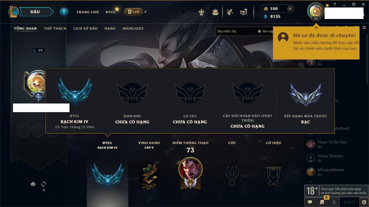 Rank Đơn: Vàng IIIKhung: VàngTướng: 77 - Còn 21172 THXTrang Phục: 8Rank ĐTCL: Kim Cương IIILinh Thú: 23