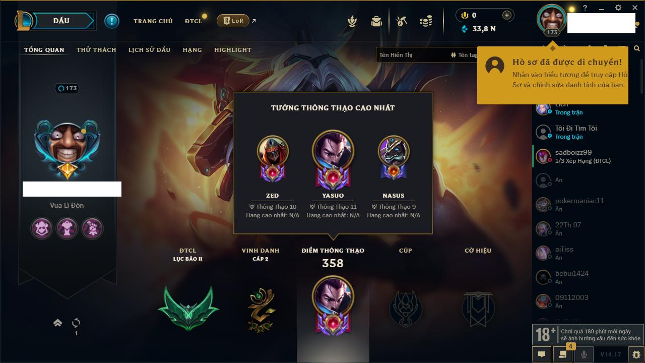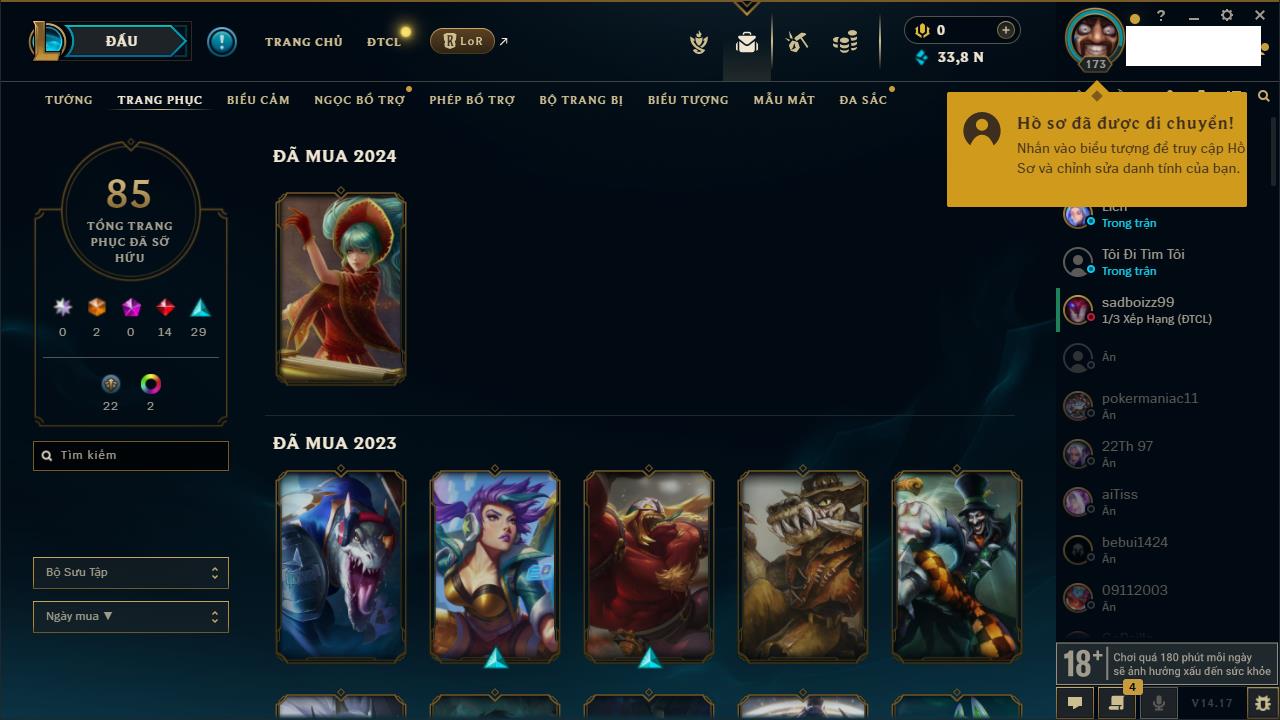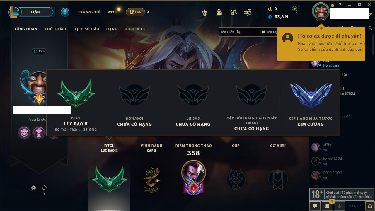 Rank Đơn: Đồng IKhung: Chưa có khungTướng: 171 - Còn 223932 THXTrang Phục: 61Rank ĐTCL: Lục Bảo ILinh Thú: 58
