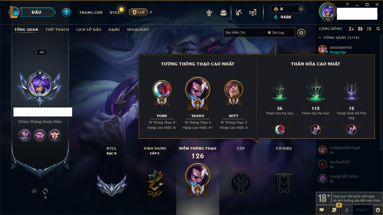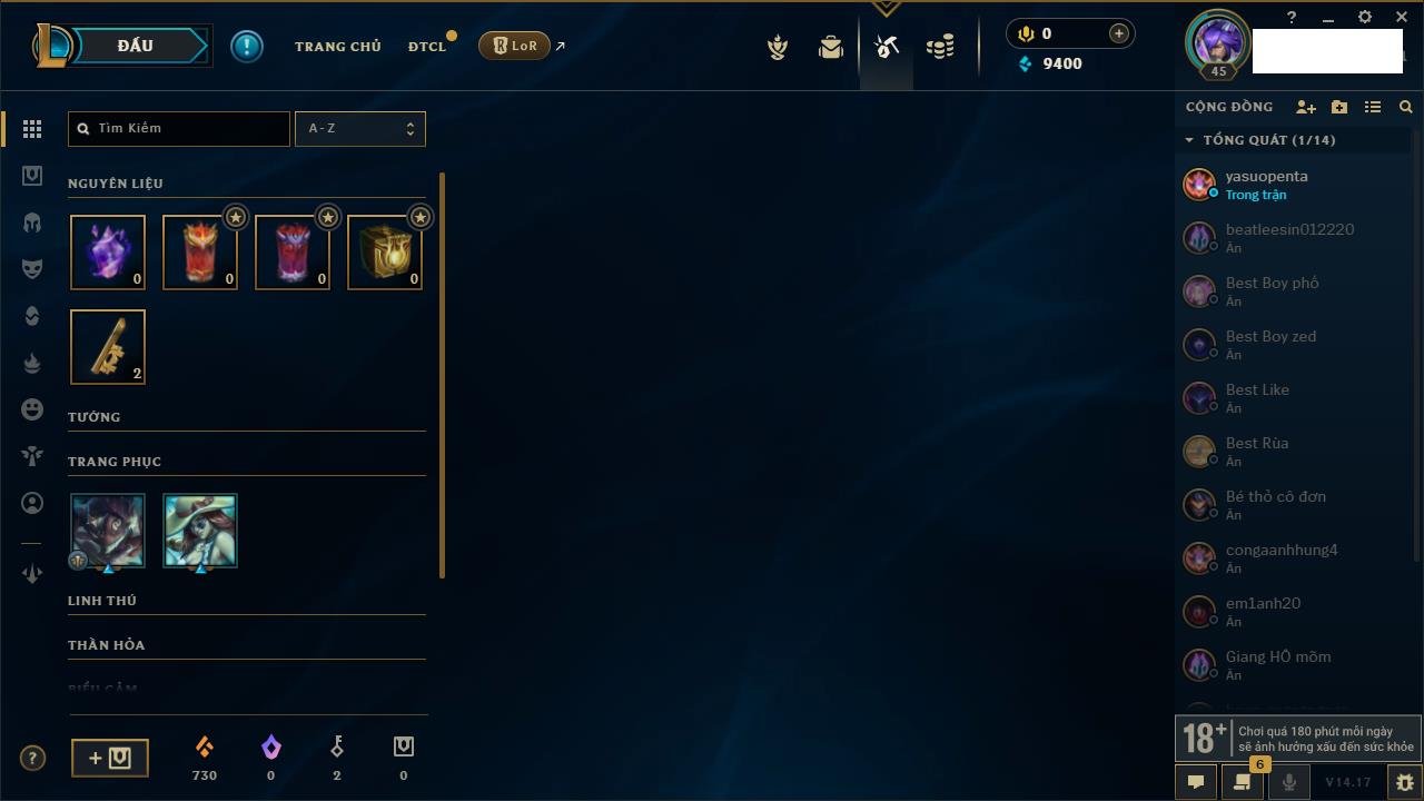 Rank Đơn: Đồng IIIKhung: Chưa có khungTướng: 86 - Còn 14367 THXTrang Phục: 19Rank ĐTCL: Vàng IIILinh Thú: 95