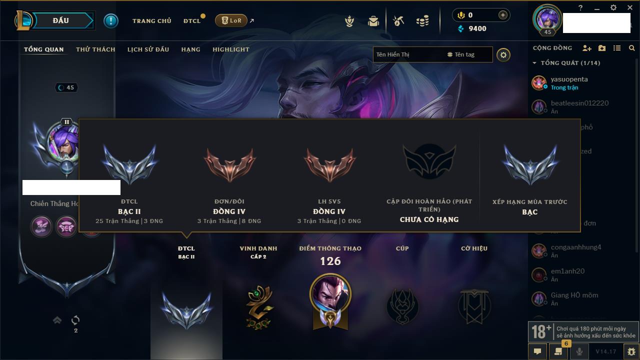 Rank Đơn: Bạc IVKhung: BạcTướng: 76 - Còn 1316 THXTrang Phục: 14Rank ĐTCL: Vàng IILinh Thú: 96