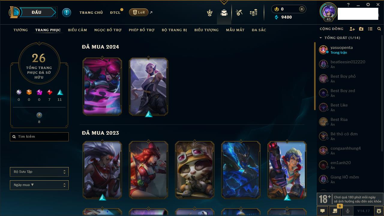 Rank Đơn: Sắt IIIKhung: Chưa có khungTướng: 77 - Còn 8133 THXTrang Phục: 11Rank ĐTCL: Bạch Kim IVLinh Thú: 108