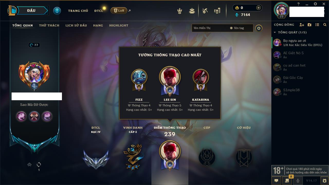 Rank Đơn: Sắt IIIKhung: Chưa có khungTướng: 77 - Còn 8133 THXTrang Phục: 11Rank ĐTCL: Bạch Kim IVLinh Thú: 108
