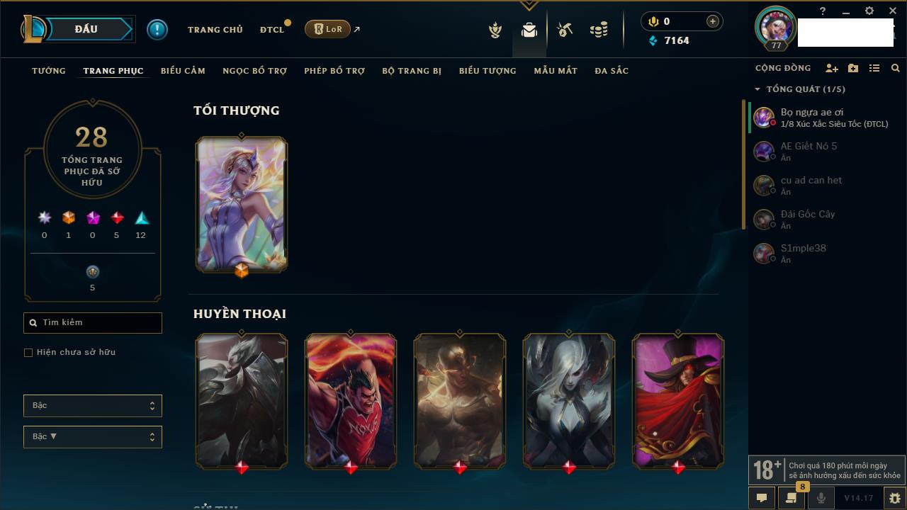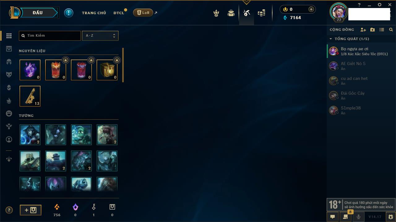 Rank Đơn: Đồng IIIKhung: Chưa có khungTướng: 86 - Còn 14367 THXTrang Phục: 19Rank ĐTCL: Vàng IIILinh Thú: 95
