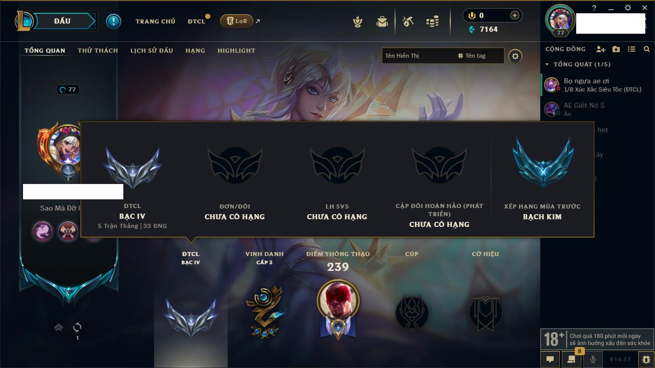 Rank Đơn: Bạc IVKhung: BạcTướng: 76 - Còn 1316 THXTrang Phục: 14Rank ĐTCL: Vàng IILinh Thú: 96